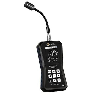 The belt tension meter is an optically measuring maintenance tool for determining the belt tension force. This belt tension meter consists of a display device and a sensor head attached on a semi-flexible gooseneck. The advantage of the gooseneck is that the sensor head can be flexibly positioned. Due to the mobility of the gooseneck, the sensor can measure the strand force even in hard to reach places. The belt tension measuring device measures the belt tension (in Newton) and the belt frequency (in Hz) of the belt in the stationary state.
