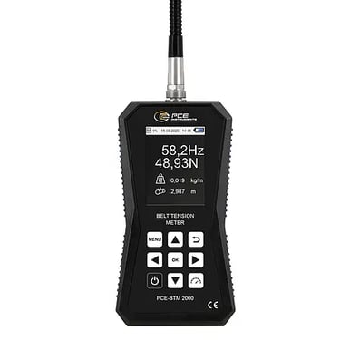 A small impulse on the belt is sufficient to set the belt vibrating. The belt tension meter measures with the sensor the natural frequency of the belt generated in this way and visualizes it on the display. The belt tension meter can directly determine the actual tension (in Newton / Pound Force) of the belt from the belt frequency combined with the optionally entered belt length and belt mass. However, entering this data is not necessarily required in order to carry out the measurements directly with the belt tension measuring device. The measurement units in the device can be switched between N (SI unit) and pound force (US unit).