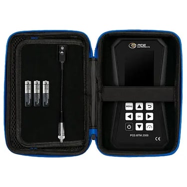 The reading is always shown as the belt frequency in Hz on the display of the belt tension measuring device. The intuitive graphic menu is visualized on the high-contrast display of the belt tension measuring device in six different languages. Up to 750 data records can be stored in the memory of the belt tension measuring device. The belt tension measuring device is delivered completely ready for use. The scope of delivery includes the handheld device, the standard sensor with gooseneck, a magnetic holder, batteries and operating manual. To increase the flexibility during the measurement, the following items are optionally available to the belt tension meter: an external sensor head with a spiral cable, a device hard case, a frequency mallet and a tripod.