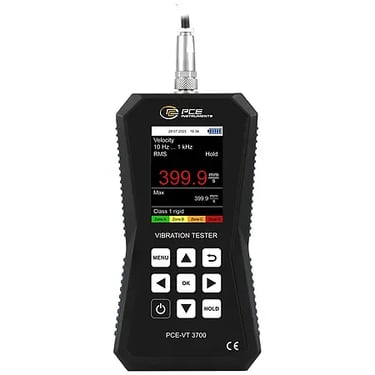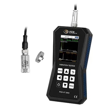 The vibration analyzer is an ideal measuring device for fast and precise checking of vibrating parts, machines and systems. This vibration meter uses the external vibration sensor to determine the vibration displacement (measuring range 0.000 ... 3.9 mm), the vibration velocity (measuring range 0.00 ... 399.9 mm/s) and the vibration acceleration (measuring range 0.0 ... 399.9 m/s²). Various measurement parameters are available for the vibration meter, such as RMS, peak, peak-peak and crest factor. The vibration meter is equipped with a mode that allows a measurement to be automatically evaluated according to the limit values of ISO 10816-3. The vibration meter analyzes the measured values and shows a corresponding good/bad rating on the display. The built-in battery in the vibration measuring device has a capacity of 2500 mAh and can be recharged directly via the built-in micro-USB interface.